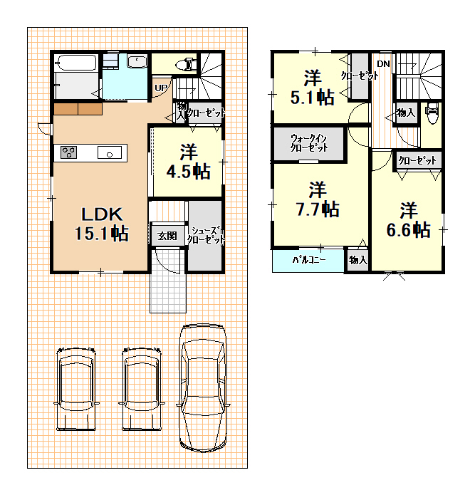 間取内容 | 1階LDK15.1畳1室 1階洋室4.5畳1室 2階洋室7.7畳1室 2階洋室6.6畳1室 2階洋室5.1畳1室 |