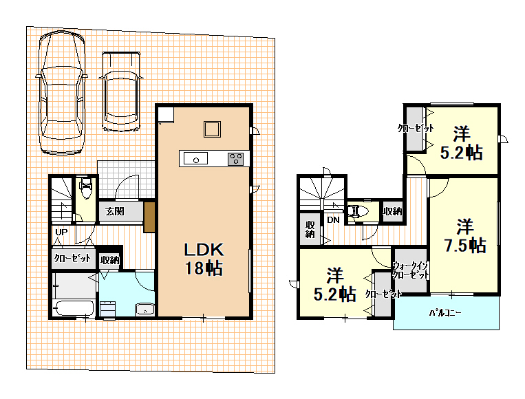 | 間取内容 | 1階LDK18畳1室 2階洋室7.5畳1室 2階洋室5.2畳2室 |