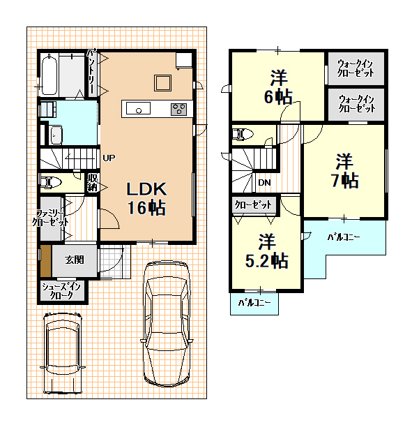 | 間取内容 | 1階LDK16畳1室  2階洋室7畳1室  2階洋室6畳1室  2階洋室5.2畳1室       |