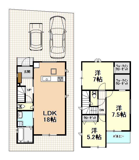 | 間取内容 | 1階LDK18畳1室  2階洋室7.5畳1室  2階洋室7畳1室  2階洋室5.2畳1室       |