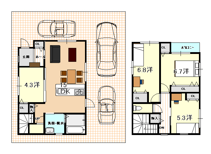 | 間取内容 | 2階和室6.8畳1室 2階洋室6.7畳1室 2階洋室5.3畳1室 1階洋室4.3畳1室 1階LDK15畳1室 |